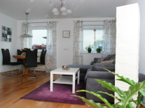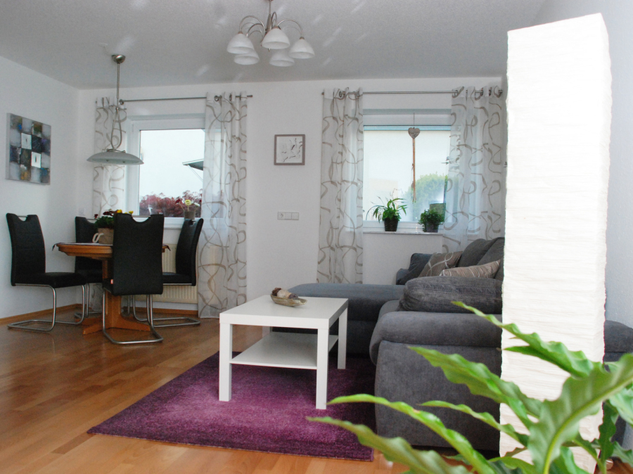 Gemütliches Wohnzimmer mit Essecke und einem Schlafsofa